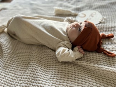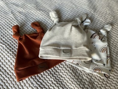 Cap made of a single layer of unique cotton knitwear. This material is flexible and fits perfectly. It perfectly protects the baby's head during walks from the sun and wind. We sew hats from safe certified knitwear.
