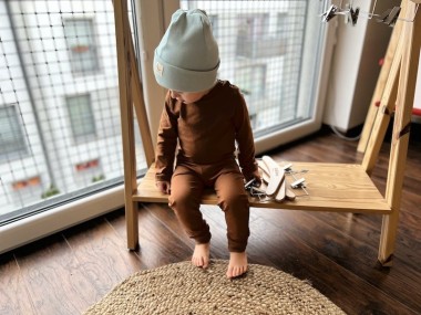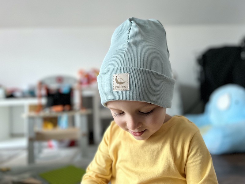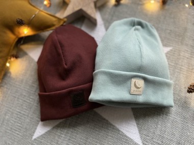 The cap is made of a double layer of soft ribbed knitted fabric of the stripe type. This material is pleasant to the touch, elastic and fits perfectly. It perfectly protects the baby's head during walks from wind and cold. We sew hats from safe certified knitwear.
