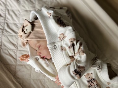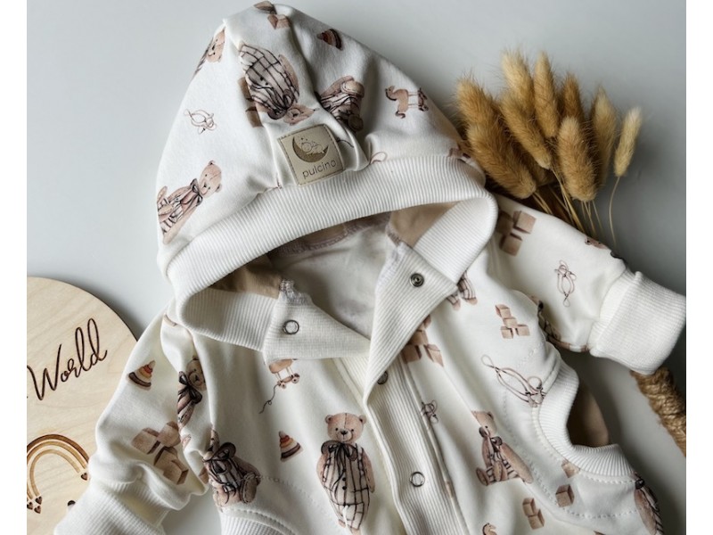 Our bestseller shop - romper made of soft sweatshirt knitwear, in the highest class of materials, which grows together with the baby. Specially designed welts at the legs and sleeves can be freely rolled up and unwinded by adding length to the clothes. The spacious hood has been sewn from two layers of material, which additionally protects the head against heat loss, it will also easily accommodate any hat when you are preparing for a walk. The jumpsuit is designed in the oversize style, its loose cut gives the baby comfort and does not restrict his movements. You can put it directly on the body or as a second layer of clothing. Fastened with nickel-free snaps, it does not hurt and does not irritate the baby's skin. Very easy to put on, which every parent will appreciate. Round pockets finished with a welt add charm to the clothes.