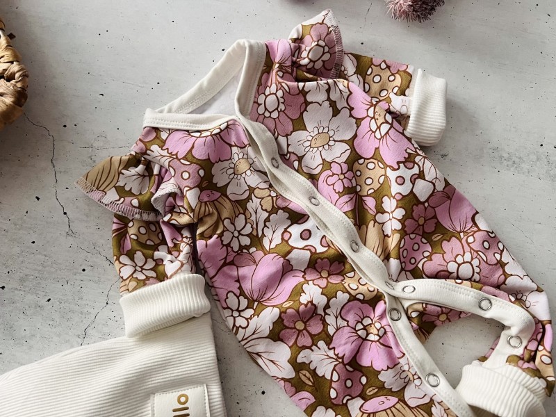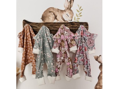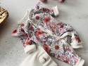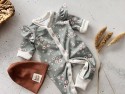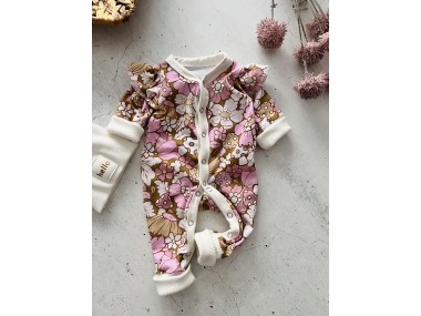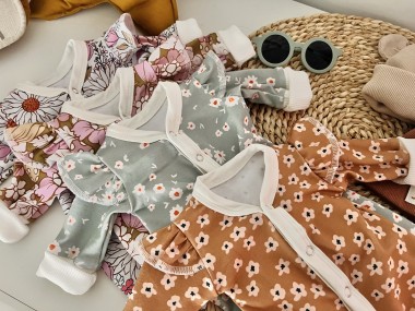 Rampers are an important element of a toddler's layette. This is a one-piece garment, necessary during night care procedures, when we want to change the child as soon as possible. The cut is similar to the classic jack, but its legs are not closed, but ended with a welt. This solution extends the time of use of the clothes, and the child is not limited by anything when it grows. It is unfastened along the entire length with nickel-free safe naps. This rampers model has charming frills at the shoulders, which gives charm and makes it serve us not only as pajamas, but also as a daytime wear.