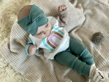 Opaska wykonana z podwójnej warstwy mięciutkiej dzianiny ściągaczowej typu prążek. Materiał ten jest miły w dotyku, elastyczny i świetnie leży. Doskonale chroni główkę dziecka podczas spacerów przed słońcem i wiatrem. Opaski szyjemy z bezpiecznych certyfikowanych dzianin.