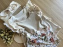 Koszulka - topik to kolejny element dziewczęcej kolekcji letniej, wśród której znajdziemy leciutkie ubranka z mieszanki bawełny i lnu. Bluzeczka z falbanką bawełnianą to jedno z tych ubranek. Materiał ma luźny splot, dlatego świetnie sprawdzi się w upalne dni. Bluzeczka jest urocza i elegancka, dlatego polecamy ją zarówno na co dzień, jak i w roli eleganckiej stylizacji na uroczystą okazję.