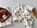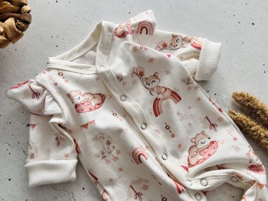 Rampers to ważny element wyprawki malucha.To ubranko jednoczęściowe, niezbędne podczas nocnych zabiegów pielęgnacyjnych, kiedy zależy nam na jak najszybszym przebraniu/przewinięciu dziecka. Krojem zbliżony jest do klasycznego pajacyka, lecz jego nogawki nie są zamknięte ,a zakończone ściągaczem.Takie rozwiązanie wydłuża czas użytkowania ubranka, a dziecka nic nie ogranicza gdy rośnie. Jest rozpinany na całej długości za pomocą bezniklowych bezpiecznych nap.Ten model rampersa posiada urocze falbanki przy ramionkach co nadaje uroku i sprawia, że posłuży nam nie tylko jako piżamka, lecz także jako ubranko dzienne.